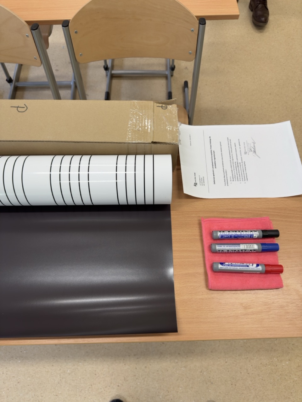 Nakładka wykonana jest z materiału magnetycznego i suchościeralnego, który pozwala na pisanie po niej za pomocą specjalnych markerów oraz przyklejenie jej do tablicy.